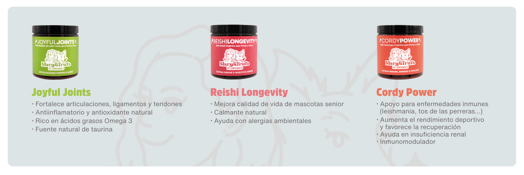 Mary & Trufa es una marca de suplementos para perros y gatos que cree en la pureza y la efectividad de lo natural. Por eso te ofrece productos 100% naturales, sin colorantes, conservantes ni aditivos, que mejoran la salud y el bienestar de tu mascota para que tenga una vida larga y feliz a tu lado.