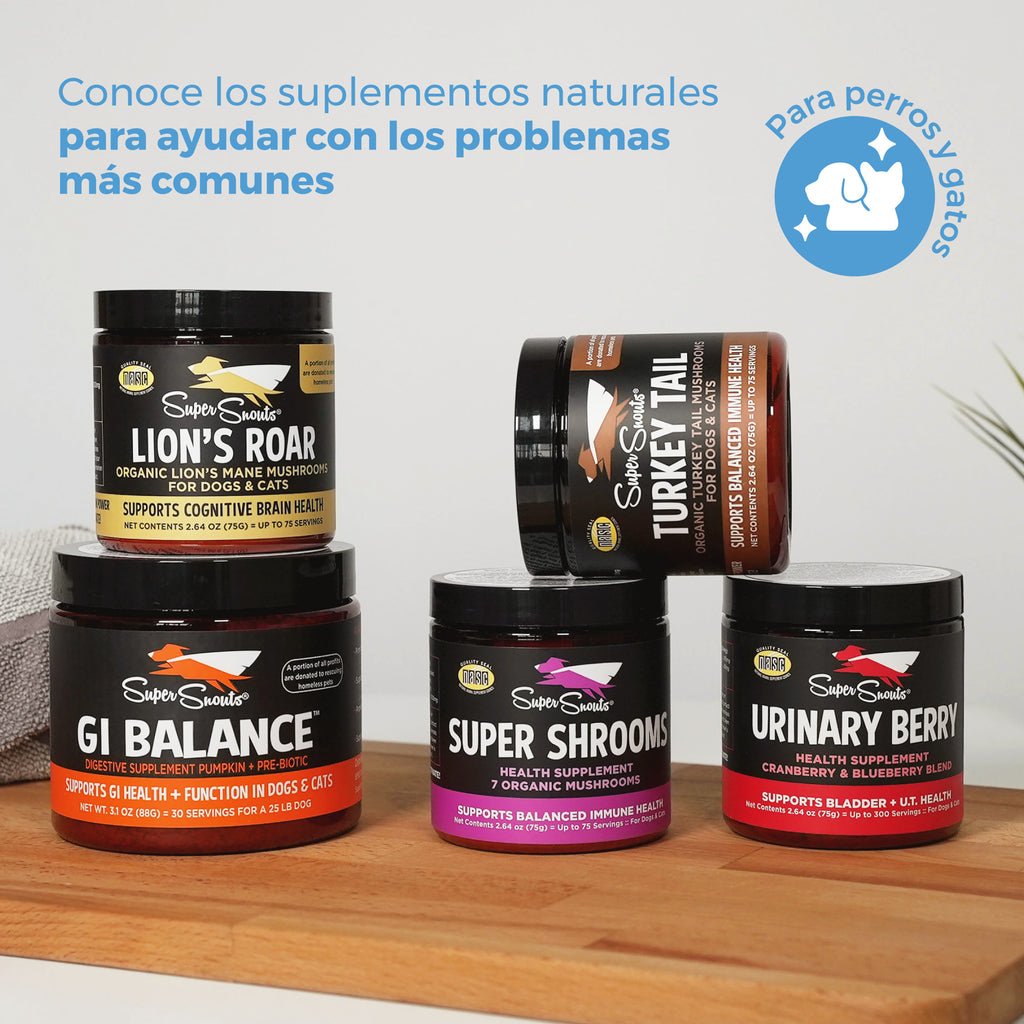 Super Shrooms es un suplemento 100% natural para perros y gatos. Contiene 7 hongos adaptógenos orgánicos (reishi, shiitake, maitake, cordyceps, chaga, melena de león y cola de pavo), cultivados con altos estándares de calidad en Norteamérica.